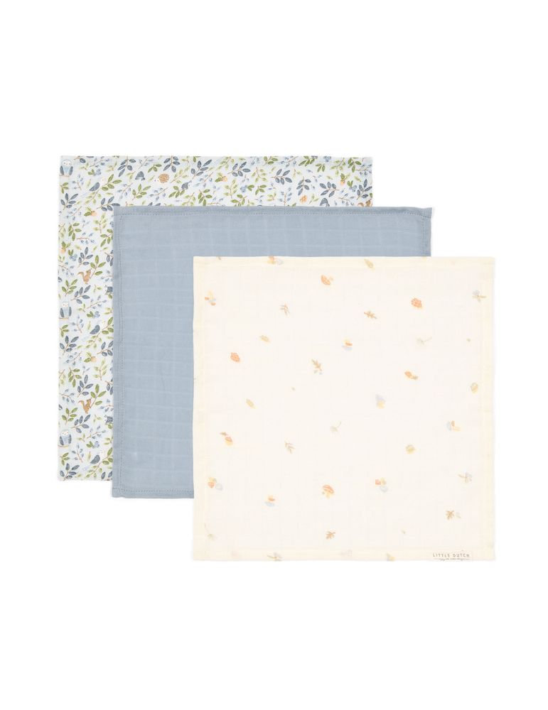 Chusteczki muślinowe 25x25 cm Forest Friends od Little Dutch. Zestaw 3 chusteczek to prawdziwy wielofunkcyjny, wyprawkowy must-have! Wykonane w 100% z bawełny organicznej, mają praktyczne i wszechstronne zastosowania podczas karmienia maluszka, wycierania śliny lub rozlanych płynów. Chusteczki przydadzą się zarówno w domu, jak i w podróży. Ten zestaw 3 chusteczek łączy wzory z kolekcji Forest Friends: Forest Adventure i Forest Treasures z jednolitym kolorem Denim Blue.