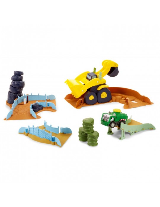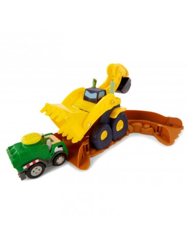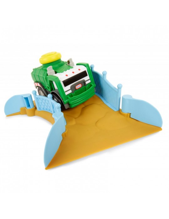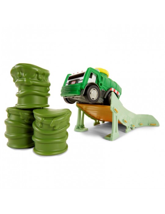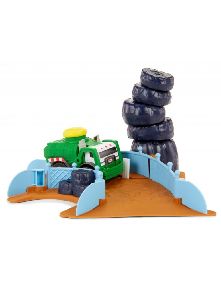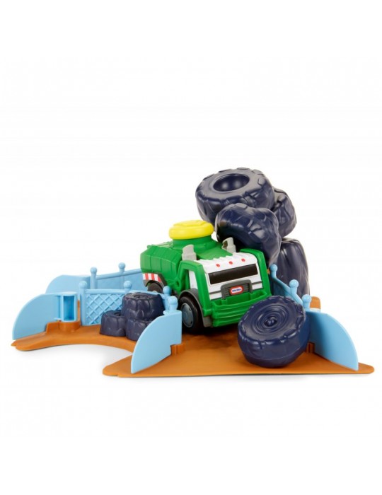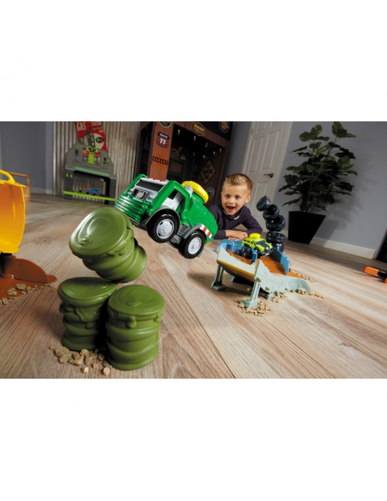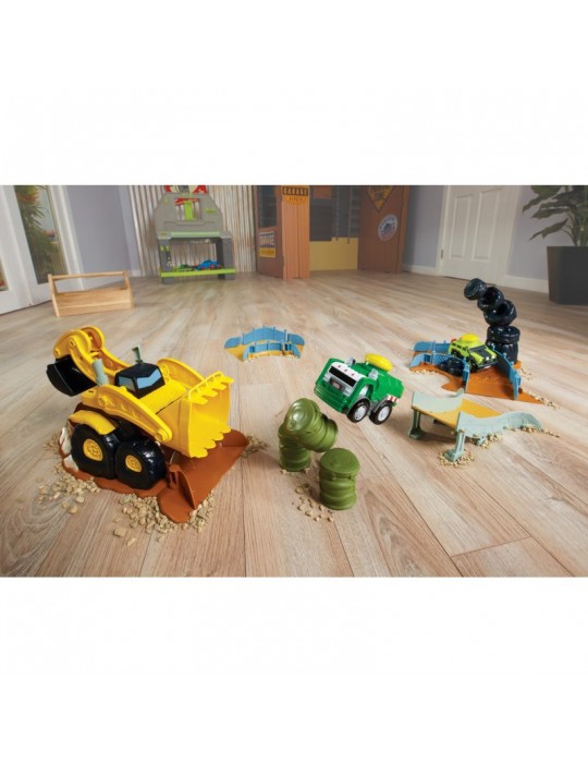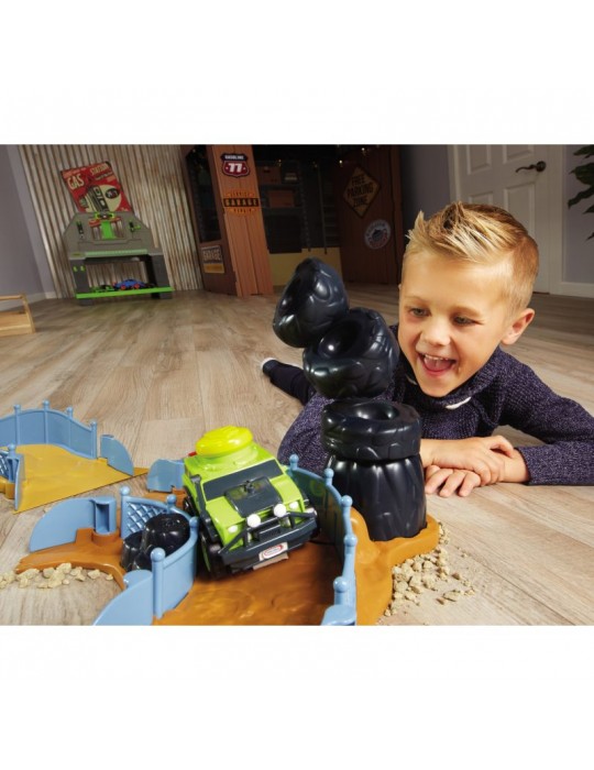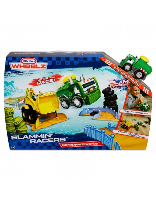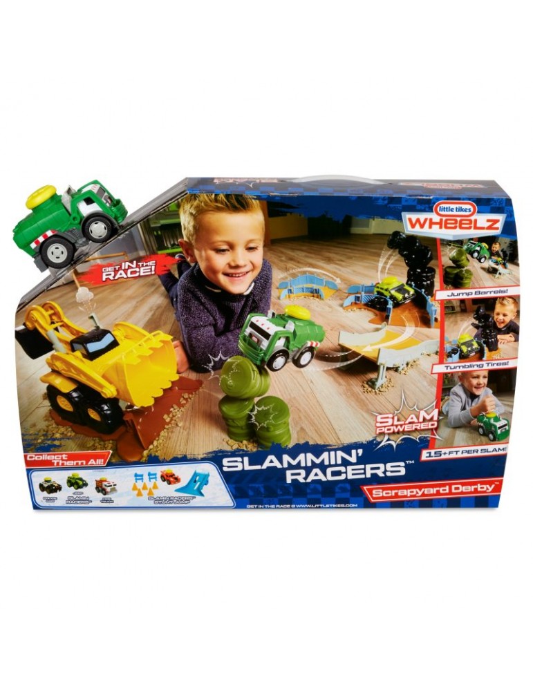 Stwórz swój własny wyścigowy tor kaskaderski wypełniony skokami, zakrętami i przeszkodami! Wystarczy jeden dotyk, by twój wymarzony pojazd wprawić w ruch i uruchomić realistyczne dźwięki i szumy. Sensor dotyku został umieszczony na dachu w formie dużego żółtego wytrzymałego przycisku, zaprojektowanym dla najbardziej aktywnych dzieci. Nowatorskie rozwiązanie zachwyci każdego malca, który w prosty sposób będzie mógł bawić się i czerpać z tego prawdziwą radość. Wciśnij przycisk na dachu i obserwuj, jak pojazd odjeżdża na ok. 4.5 metra, jeśli nie więcej lub jak jeździ po ustawionym torze! W serii Slammin' Racers dostępny jest samochód policyjny, wóz strażacki i Off-Road SUV (sprzedawane oddzielnie w zależności od dostępności), zbierz całą kolekcję i wystartuj w wyścigu! Zestaw Arena do wyścigów zawiera śmieciarkę, zakręt z tunelem w postaci stuningowanej koparki, zakręt z przewracającymi się oponami, zakręt z ogrodzeniem, stromą wyskocznie, beczki do przeskakiwania.