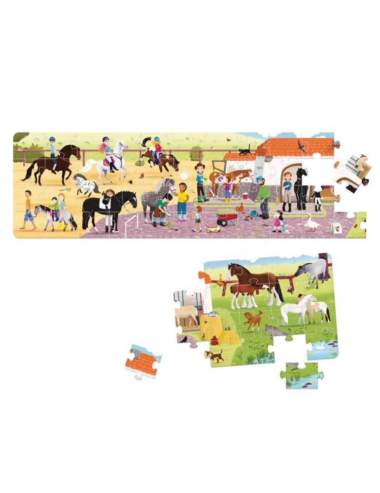 Ihaha! Czas pobrykać! Długa panoramiczna układanka przedstawia to, co dzieje się w słonecznej stadninie. Zabawa doskonali małą motorykę, spostrzegawczość i wyobraźnię.