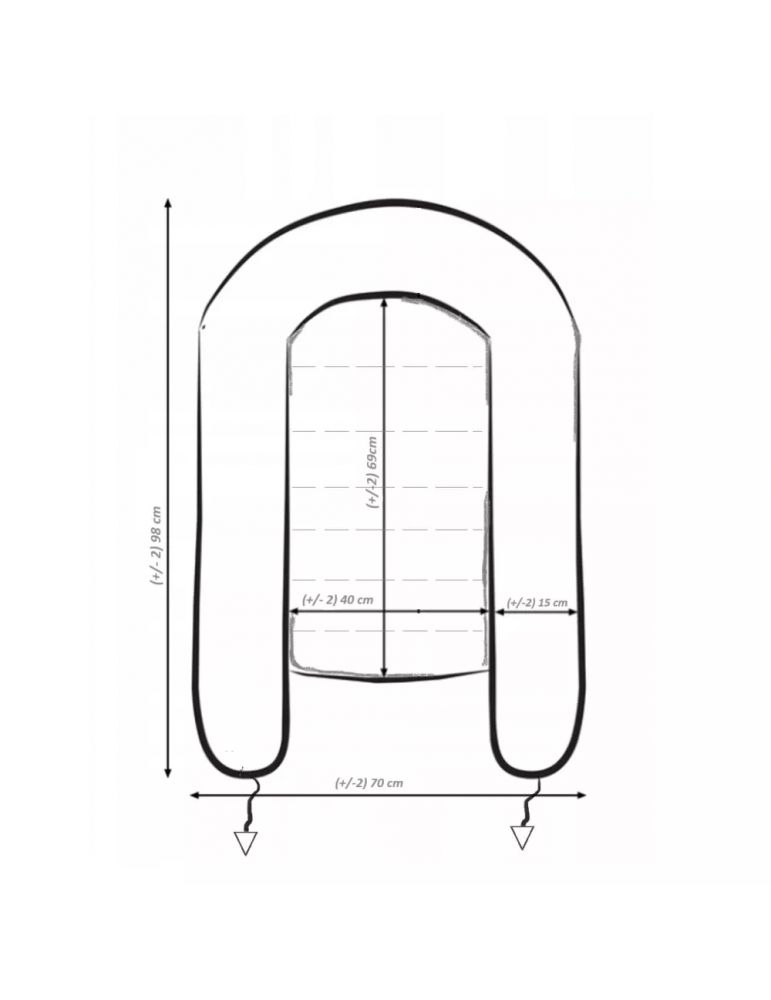 Jego rozmiar można regulować za pomocą bawełnianego sznureczka, który na końcu jest ozdobiony serduszkami. Wymiary zewnętrzne (po rozwiązaniu sznureczków): 77x56 cm (+/- 2 cm)wymiary wewnętrzne (po rozwiązaniu sznureczków) 66x36 cm (+/- 2 cm).