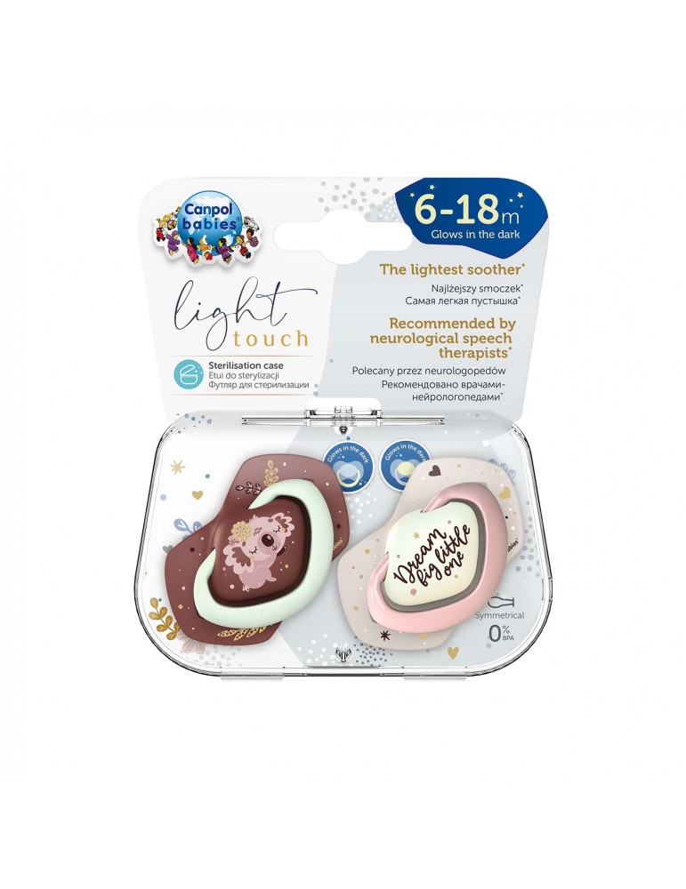 Rekomendowany przez specjalistów jako pierwszy smoczek Twojego Maluszka.* Smoczki Light touch stworzono by zapewnić maksymalny komfort najmłodszym dzieciom. Ich wyjątkowo miękka silikonowa gumka wymaga mniej wysiłku podczas ssania, a lekka, profilowana tarczka nie obciąża zgryzu i gwarantuje swobodne oddychanie, co według specjalistów ma istotny wpływ na prawidłowy rozwój jamy ustnej dziecka.** Wygodny uchwyt smoczka pozwala na przymocowanie łańcuszka i ułatwia podanie go dziecku. Świecące w ciemności elementy - tarczka lub uchwyt, ułatwiają odnalezienie smoczka nocą. Smoczki Light touch z łatwością utrzymasz w czystości, dzięki nowoczesnemu etui, które może służyć do przechowywania, ale też do szybkiej i wygodnej dezynfekcji w kuchence mikrofalowej. Wystarczy odrobina wody i 2 minuty by zapewnić smoczkom higieniczną czystość. Smoczki Light touch dostępne są w kilku wyjątkowych, inspirowanych najnowszymi trendami kolekcjach i różnych rozmiarach – rosną razem z Twoim Maluszkiem.
