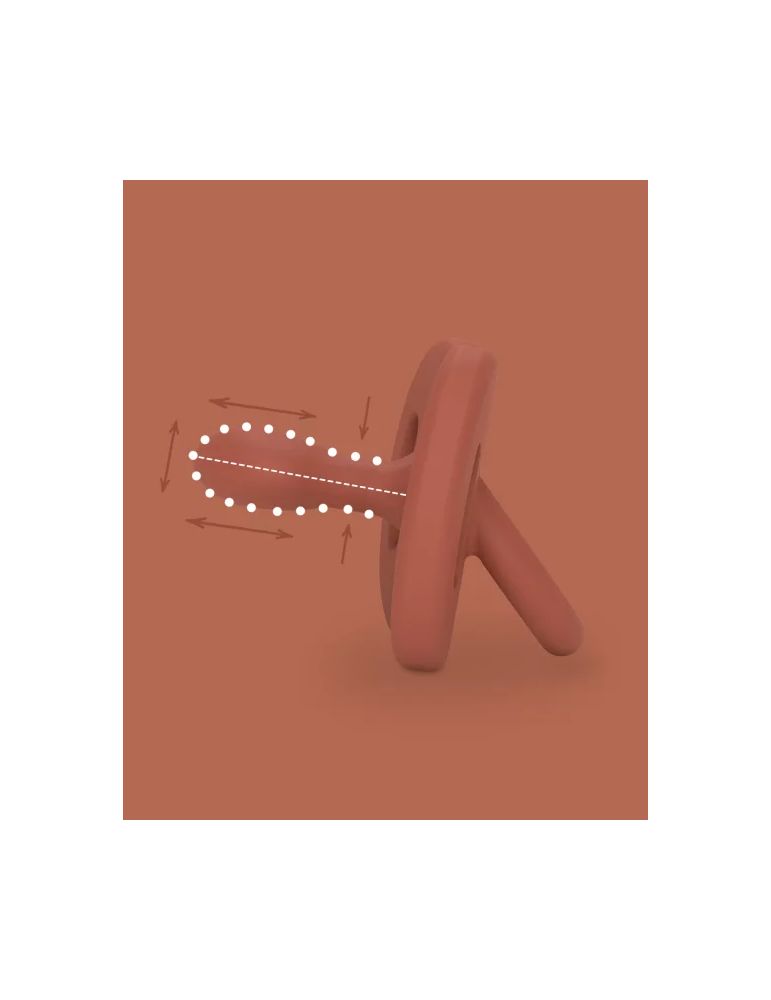 Stworzony z bezpiecznego silikonu, bez plastikowych elementów i z delikatną dla buzi tarczką. Jego kształt pozwala na zawsze prawidłowe umieszczenie w ustach maluszka.
