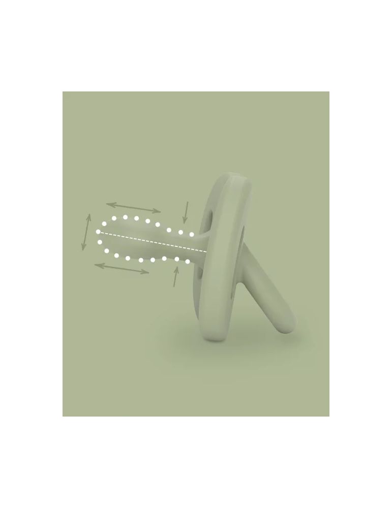 Stworzony z bezpiecznego silikonu, bez plastikowych elementów i z delikatną dla buzi tarczką. Jego kształt pozwala na zawsze prawidłowe umieszczenie w ustach maluszka.
