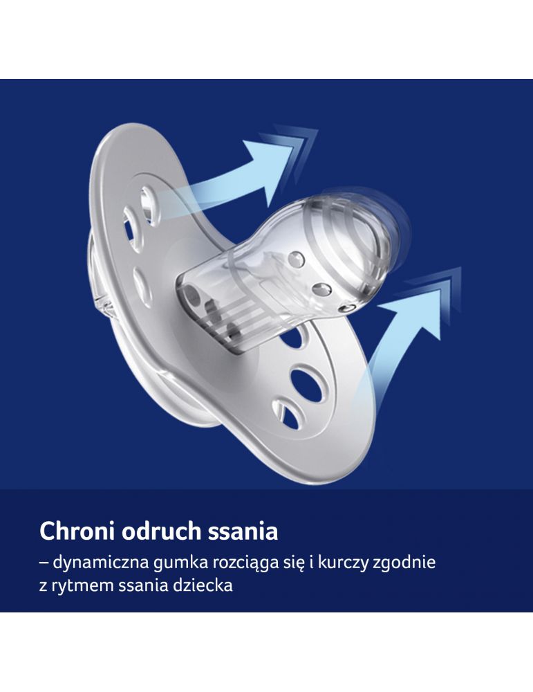 Dynamiczna gumka smoczka jest spłaszczona, a aktywna szyjka w trakcie ssania staje się tak cienka, by umożliwić dziecku SWOBODNE domykanie i odpowiednią pracę dziąseł podczas ssania oraz zapewnić wystarczającą ilość miejsca w buzi na pracę języka, co zmniejsza ryzyko wad zgryzu i wymowy.