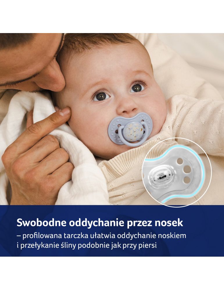 Profilowana tarczka z odpowiednim wycięciem na nosek maluszka, co ułatwia oddychanie noskiem i przełykanie śliny podobnie jak przy piersi.