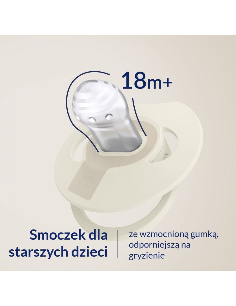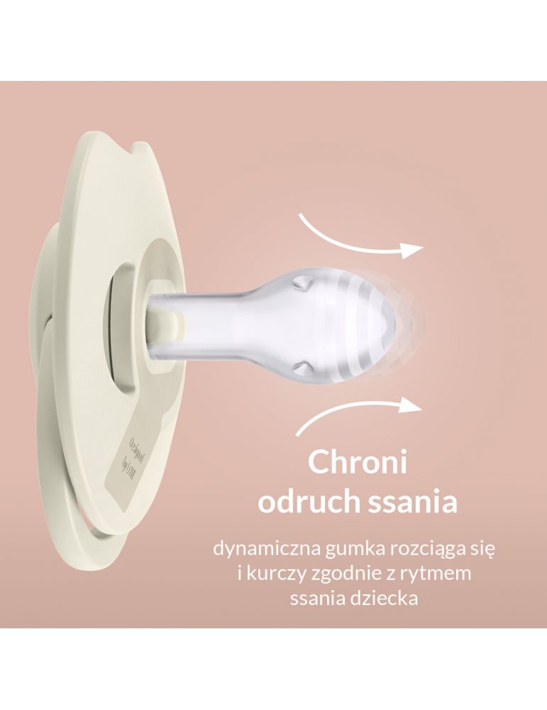 Dynamiczny smoczek, dzięki unikalnej budowie z silikonu o różnej grubości, rozciąga się i kurczy zgodnie z rytmem ssania dziecka. Dzięki temu chroni jego odruch ssania i nie ma niekorzystnego wpływu na karmienie piersią. Kształt gumki jest symetryczny i inspirowany kształtem brodawki sutkowej, by zapewnić dziecku znajome odczucia. Tarczka smoczka ma specjalne wycięcie, by ułatwić oddychanie noskiem i przełykanie śliny podobnie jak przy piersi. Wyprofilowana tarczka jak najmniej przylega do skóry dziecka, co ułatwia swobodny przepływ powietrza i zmniejsza ryzyko podrażnień skóry.