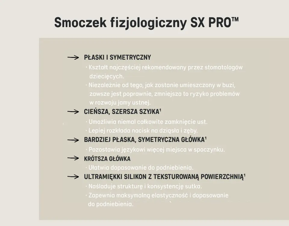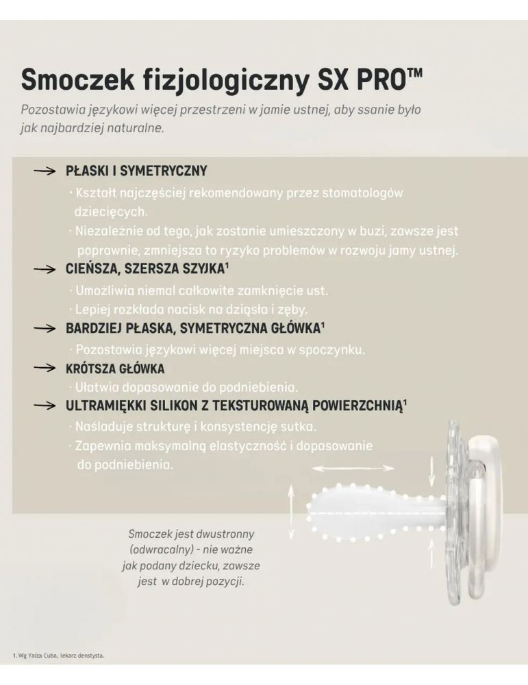 Najbardziej innowacyjny smoczek fizjologiczny na rynku SX Pro został zaprojektowany z myślą o specyfice jamy ustnej noworodka, którego dolna i górna szczęka dopiero się rozwija. Rewolucyjny kształt smoczka SX Pro pozwala językowi pozostać w pozycji, którą dziecko naturalnie i fizjologicznie utrzymuje podczas karmienia piersią.