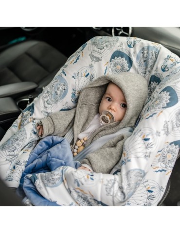 Część zewnętrzna uszyty jest z niezwykle miękkiego pikowanego velvetu, natomiast część wewnętrzna z przewiewnej i niezwykle przyjemnej w dotyku 100% bawełny organicznej (jersey). Obie tkaniny posiadają certyfikat OEKO-TEX Standard 100. Kocyk jest niezwykle praktyczny i wygodny w użytkowaniu. Łatwe zapięcie na rzep umożliwia przykrycie lub odkrycie dziecka jednym ruchem. Rzep pozwala na dostosowanie szerokości kocyka do indywidualnych potrzeb i zabezpiecza dziecko przed odkrywaniem się podczas snu. Po zapięciu kocyka na rzep naszyty na górze kocyka, tworzy się miękki kaptur otulający główkę dziecka. Kocyk ma 6 otworów na pasy bezpieczeństwa, dopasowanych do 3-punktowego systemu zabezpieczeń w fotelikach samochodowych. Pasuje do większości fotelików, nosidełek i wózków.
