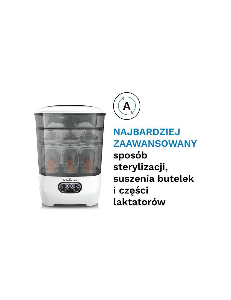 - Suszy o 33% szybciej w porównaniu do poprzedniego modelu sterylizatora Baby Brezza oraz do większości modeli dostępnych na rynku.