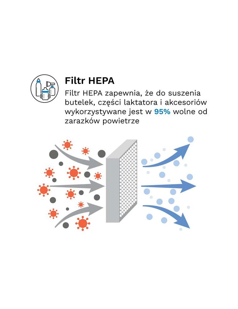 Dlaczego filtry HEPA są ważne? Jak można przeczytać w opisie, sterylizator do butelek jest dostarczany z bezpłatnym filtrem HEPA. Ten filtr „High-Efficiency Particulate Air” jest niezbędny, aby butelki były jak najczystsze, a dziecko jak najbezpieczniejsze. Filtr HEPA działa podczas procesu suszenia, pomagając utrzymać pleśń, bakterie, kurz i pyłki z dala od świeżo wysuszonych butelek. Mikroskopijne cząsteczki unoszące się w powietrzu mogą wpływać na zdrowie lub alergie malucha, więc ten sterylizator do butelek jest tutaj, aby pomóc, zapewniając dodatkową ochronę podczas suszenia. Pamiętaj, aby wymieniać filtr co 3 miesiące, aby zapewnić najlepszą możliwą ochronę!