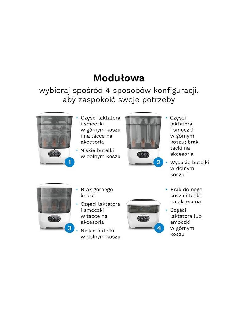 - Suszy i sterylizuje butelki wszystkich marek, części laktatorów, smoczki, gryzaki, kubki niekapki, zabawki i inne akcesoria w 1 prostym kroku, oszczędzając czas.