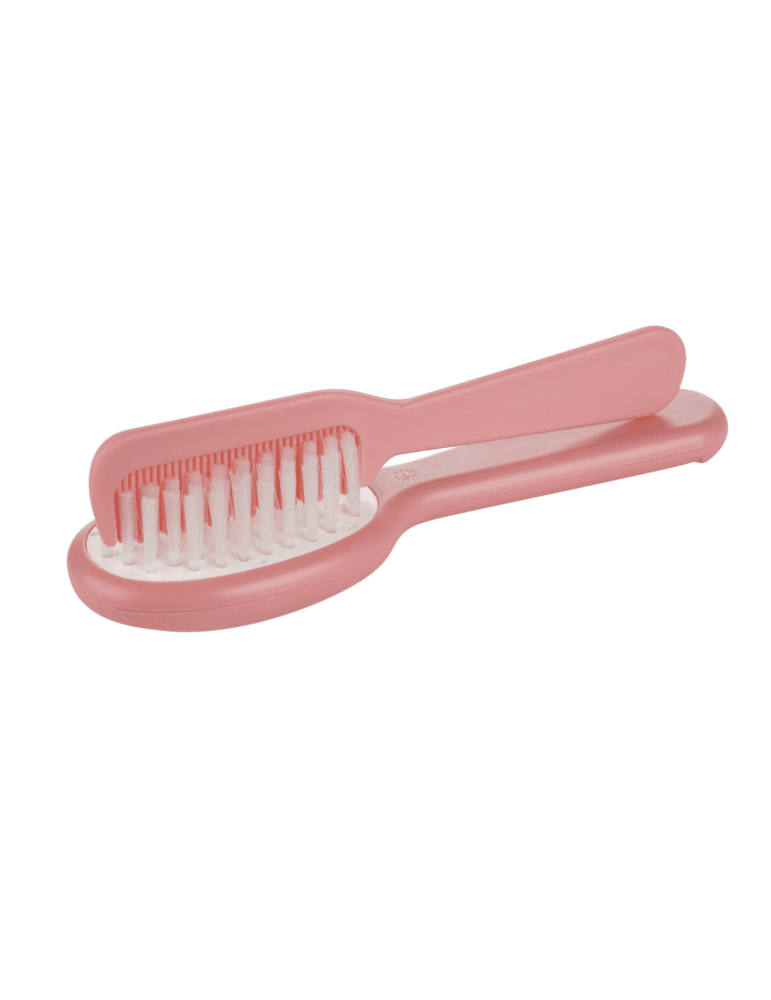 Szczotka i grzebień dla niemowląt to idealny zestaw do czesania pierwszych włosków i masażu główki dziecka. Zaokrąglone ząbki grzebienia nie podrażniają wrażliwej skóry, a syntetyczne włosie szczotki gwarantuje bezpieczną i przyjemną pielęgnację delikatnych włosków maluszka. Ergonomiczny kształt grzebienia i szczotki ułatwia wygodne użytkowanie, a specjalny schowek na grzebień pomoże w utrzymaniu porządku w akcesoriach maluszka.