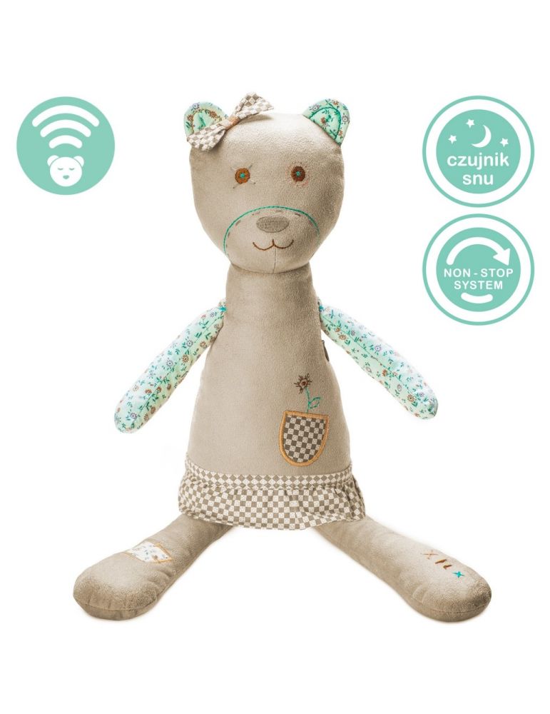 Czujnik Snu - Po 60 minutach od włączenia misia szum powoli wycisza się i sam wyłącza a Szumiś przechodzi w tryb czuwania. Kiedy Maluszek zaczyna się przebudzać, kręci się czy płacze, szum automatycznie włączy się na wybrany ostatnio dźwięk. Po 60 minutach mechanizm znów się wyłączy i przejdzie w tryb czuwania.