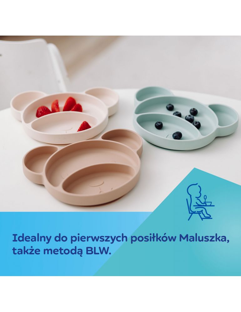 To wyjątkowy moment, kiedy Twoje dziecko zaczyna samodzielnie jeść. Silikonowy talerz z przyssawką MIŚ jest idealny do pierwszych posiłków Maluszka na początku jego przygody z rozszerzaniem diety, także metodą BLW (Bobas Lubi Wybór). Cztery przegródki ułatwiają porcjowanie i sortowanie różnych smakołyków, co zachęca do próbowania nowych smaków i samodzielnego jedzenia. Talerz ma antypoślizgową przyssawkę, która zapobiega niekontrolowanemu przemieszczaniu się naczynia po powierzchni stołu lub blatu krzesełka do karmienia, uniemożliwia wywrócenie naczynia lub zrzucenie w całości na podłogę. Talerzyk trójdzielny z przyssawką został wykonany w 100% z wysokiej jakości silikonu przeznaczonego do kontaktu z żywnością. Talerz silikonowy jest elastyczny, wytrzymały i nietłukący się, co jest bardzo istotne w przypadku małych dzieci. Można myć w zmywarce i podgrzewać w mikrofalówce.