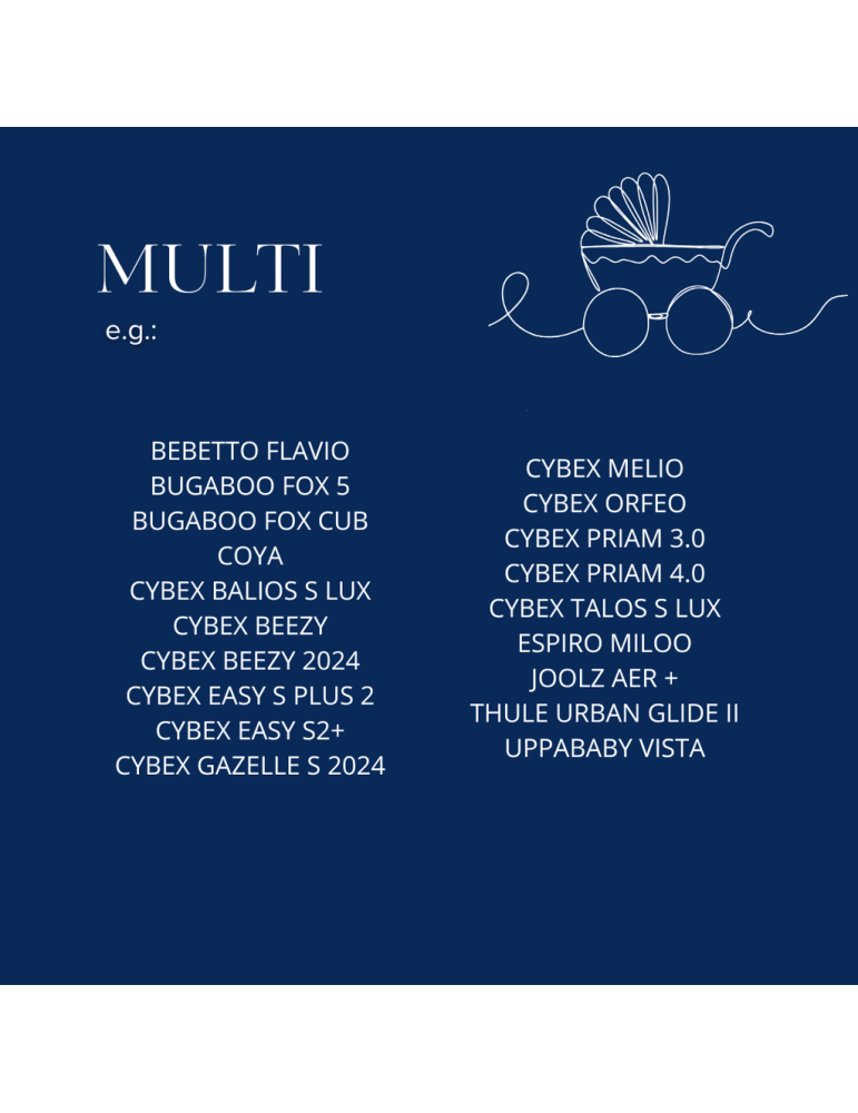 Wkładka do wózka w wersji Multi posiada, aż 4 otwory na pasy bezpieczeństwa i 2 otwory do przymocowania poduszki antywstrząsowej Angel Wing’s. Te 6 otworów pozwala na dopasowane wkładki do 5-cio punktowego systemu zabezpieczeń w większości wózków, także tych z nierozpinanymi pasami typu CYBEX. Pionowe otwory posiadają bezuciskowy rzep, dzięki któremu wkładka nie będzie się przemieszczać i idealnie dopasuje się do siedziska wózka.Wnętrze wkładki to gruba, bardzo sprężysta i miękka pianka, dzięki której dziecku jest komfortowo i wygodnie. Wkładka jest dwustronna – jedna strona to organiczny bawełniany jersey, a druga to miły w dotyku elegancki velvet.Wkładka do wózka Multi amortyzuje wstrząsy, chroni skórę dziecka przed kontaktem z nieprzyjemnym obiciem wózka, zapobiega zabrudzeniom wózka oraz sprawia, że wózek wygląda unikatowo i stylowo. Do wkładki można dokupić opaskę, dzięki której zamocujesz poduszkę angel's wings.