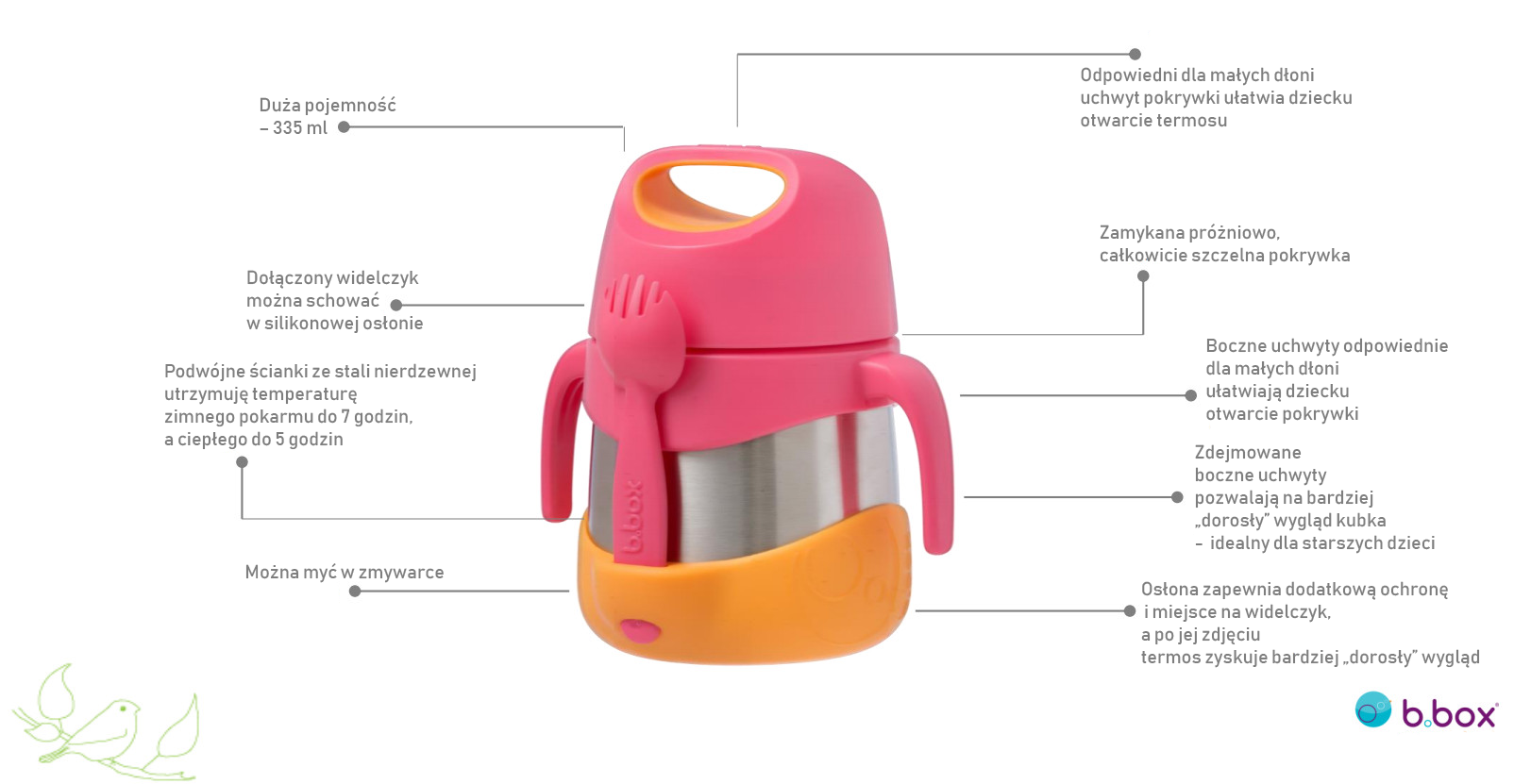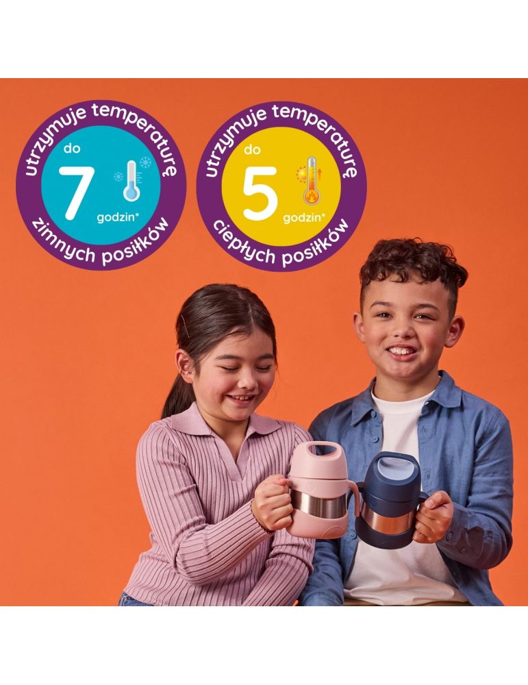Termos obiadowy b.box w kolorze pomarańczowo- różowym ze stali nierdzewnej o pojemności 335 ml. Posiada podwójne ścianki utrzymujące temperaturę zimnego posiłku do 7 godzin i ciepłego do 5 godzin, szczelną pokrywkę, boczne zdejmowane uchwyty dostosowane do małych dłoni, silikonową osłonę z miejscem na widelec oraz możliwość mycia w zmywarce.
