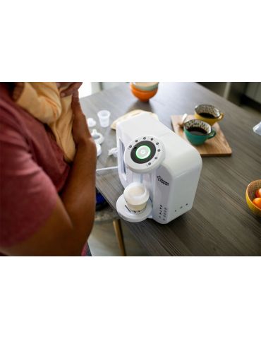 To prawdziwy domowy pomocnik, który bierze na siebie przygotowywanie pokarmu zawsze o idealnej konsystencji i temperaturze takiej samej jak mleko matki, ponieważ najpierw dozuje gorącą wodę, a potem reguluje jej ciepłotę puszczając zimną.