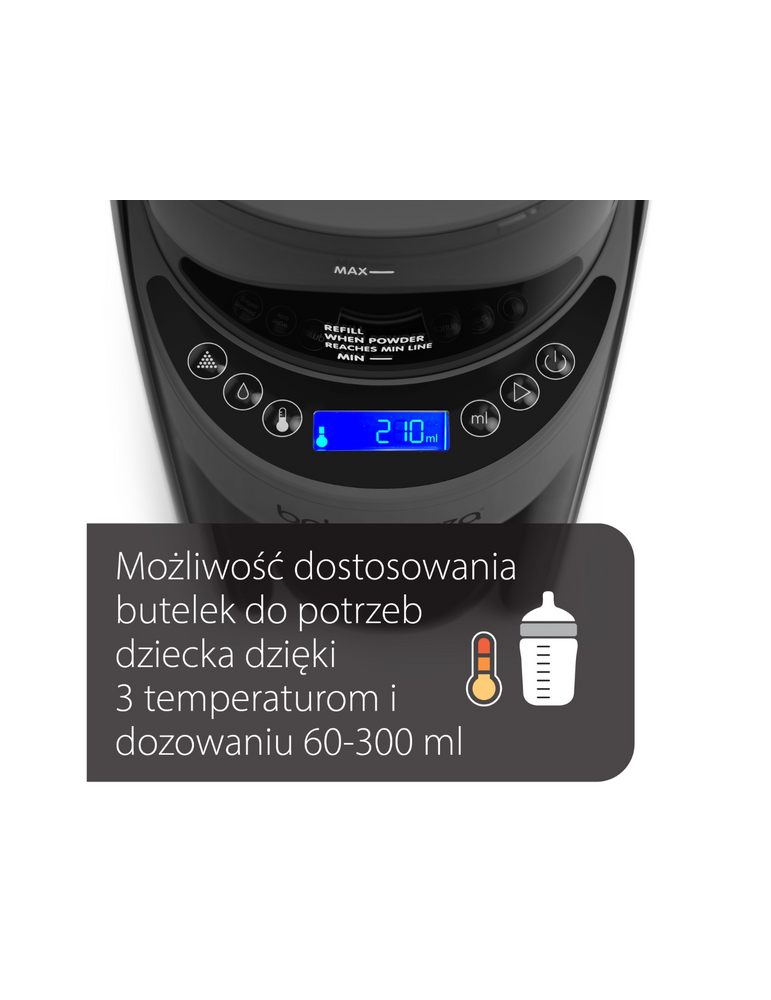 6. Urządzenie automatycznie dostosowuje ilość proszku niezbędną do przygotowania butelki do wybranej przez Ciebie objętości wody, w zgodzie z zaleceniami producenta mleka modyfikowanego umieszczonymi na opakowaniu