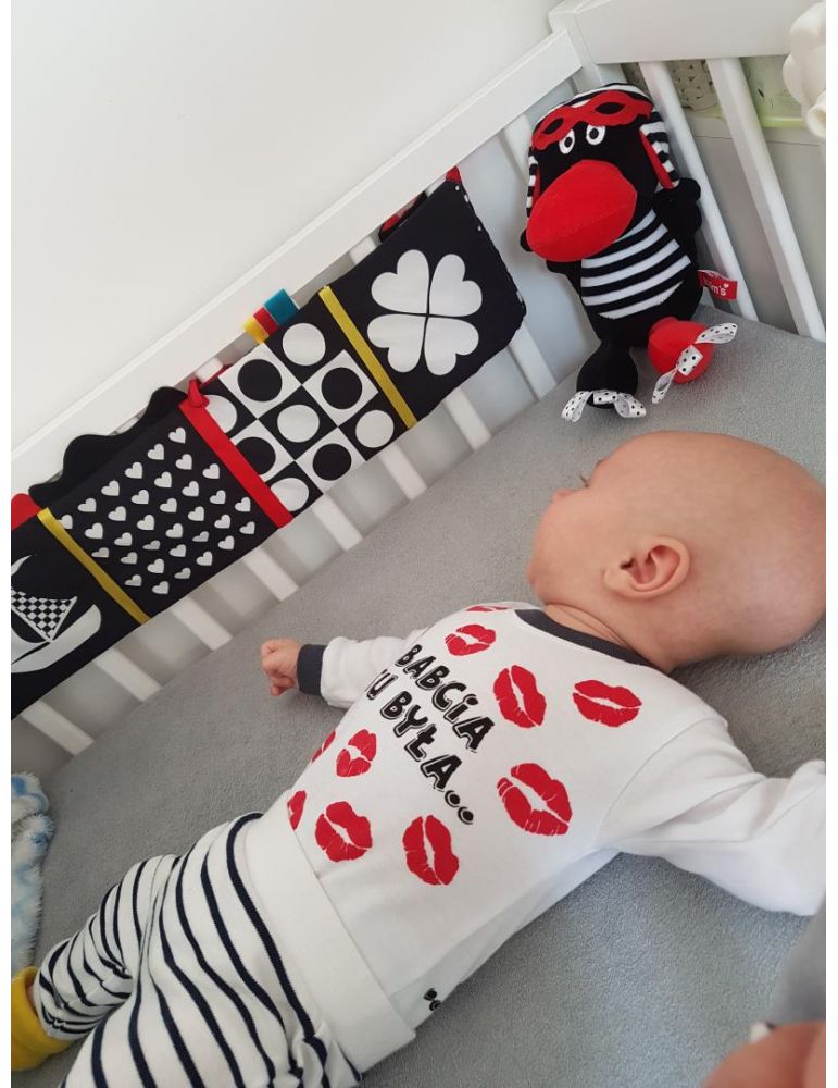 Książeczka pełna jest niespodzianek. Liczne elementy interaktywne takie jak szeleszczące strony, metki, geometryczne wzory, z pewnością zapewnią dziecku wspaniałą zabawę na długi czas dodatkowo stymulując jego zmysły. Kontrastowa książeczka wyposażona jest w dodatkowe sznureczki, które pozwalają na przymocowanie zabawki do łóżeczka lub wózka. W trosce o bezpieczeństwo Waszych pociech dostosowaliśmy rozmiar książeczki tak by pasowała do łóżeczka i dzięki temu chroniła malucha przed uderzeniem o szczebelki.