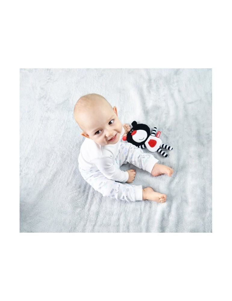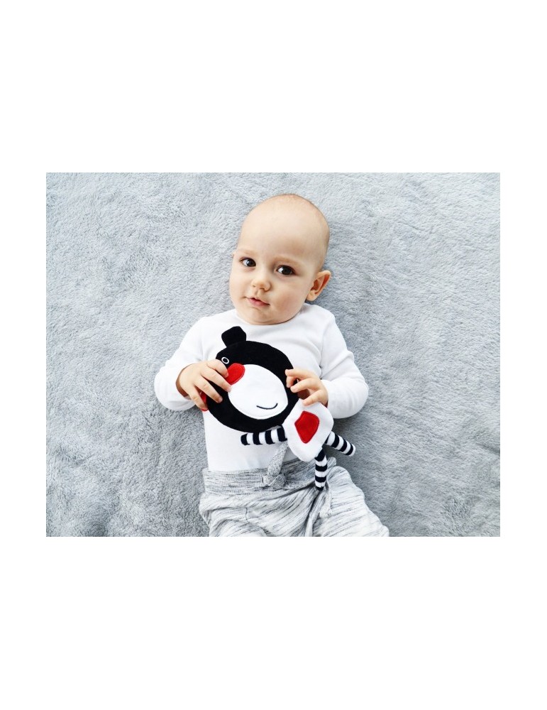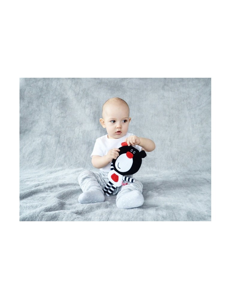 Niby niepozorne, a jednak Misie Buu to sensoryczne zabawki przemyślane w każdym calu. Prosty lekki miś jest na tyle łatwy w chwytaniu, że może towarzyszyć dziecku od pierwszych chwil, nieważne czy w łóżeczku czy na spacerze. Zestawienie mocno kontrastujących ze sobą kolorów nie tylko skupia wzrok dziecka, ale także stymuluje jego rozwój w pierwszych miesiącach życia. Interakcje dziecka z zabawką wspiera szeleszczenie wydawane przy potarciu zabawki.