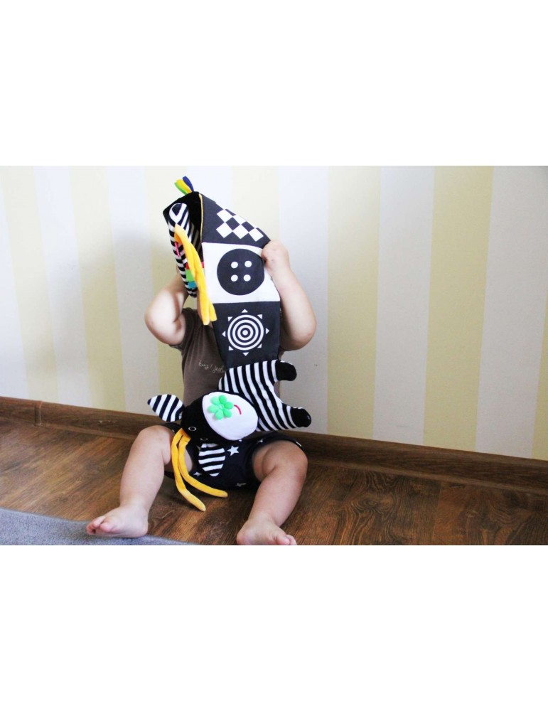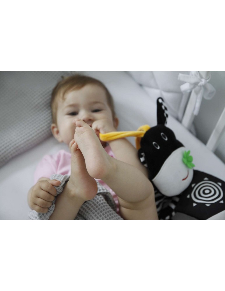 Mięciutka, materiałowo-harmonijkowa książeczka kontrastowa Króweczka Mom'care została stworzona z myślą o najmłodszych. To właśnie w pierwszym okresie życia dziecka kluczową rolę odgrywa stymulacja zmysłów. Wodzenie spojrzeniem i wpatrywanie się w zabawki rozwija zmysł wzroku oraz spostrzegawczość malucha. Do uszycia książeczek sensorycznych używamy bezpiecznych, przyjemnych w dotyku materiałów o różnej strukturze, które z pewnością zaciekawią badawcze paluszki. Dzięki temu dziecko poznaje świat i stymuluje zmysł dotyku. Nie zapominamy także o prawidłowym rozwoju zmysłu wzroku. Przewaga biało-czarnych, szeleszczących ilustracji trenuje spostrzegawczość i koordynację ruchową oko-ręka. Wraz z upływem czasu dziecko widzi coraz lepiej, więc można sięgać po zabawki w innych kontrastujących barwach.