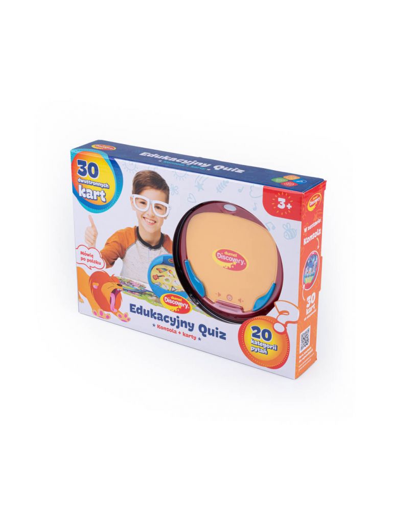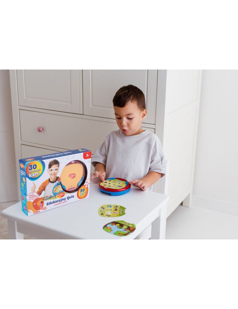 Sprawdź swoją wiedzę z zakresu 20 kategorii w domu, a także w podróży! Przenośna konsola – Edukacyjny Quiz, to zabawka, która wyposażona jest w zestaw 30 dwustronnych kart z pytaniami oraz, umieszoną z tyłu, praktyczną kieszonkę do ich przechowywania. Aby przystąpić do zabawy, należy umieścić wybraną kartę w konsoli, uruchomić zabawkę, naciskając przycisk ON/OFF na karcie, a następnie czerwoną kropkę przy tej odpowiedzi/odpowiedziach, które wybierasz. Zabawka poinformuję Cię czy masz rację!