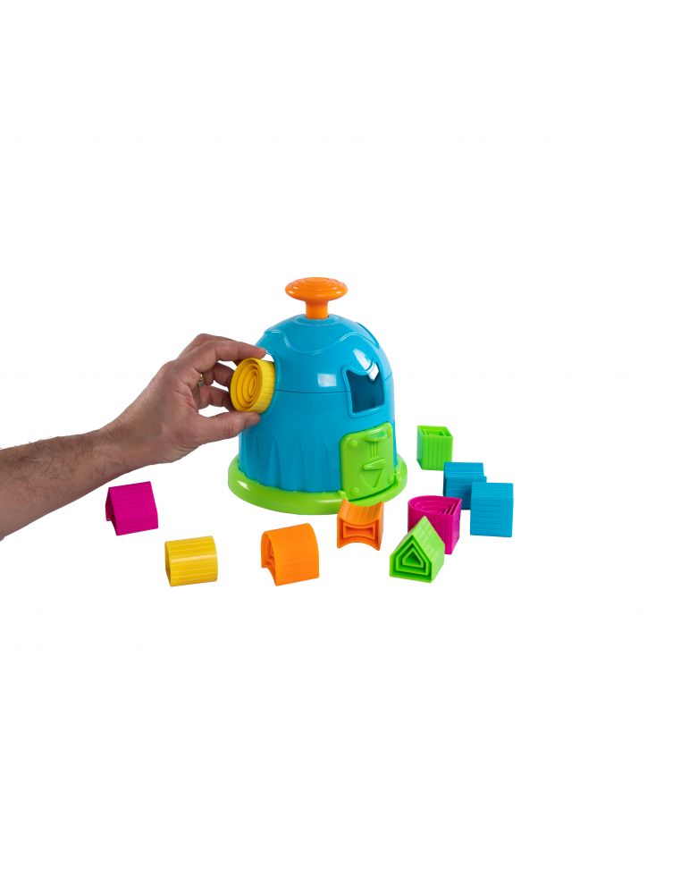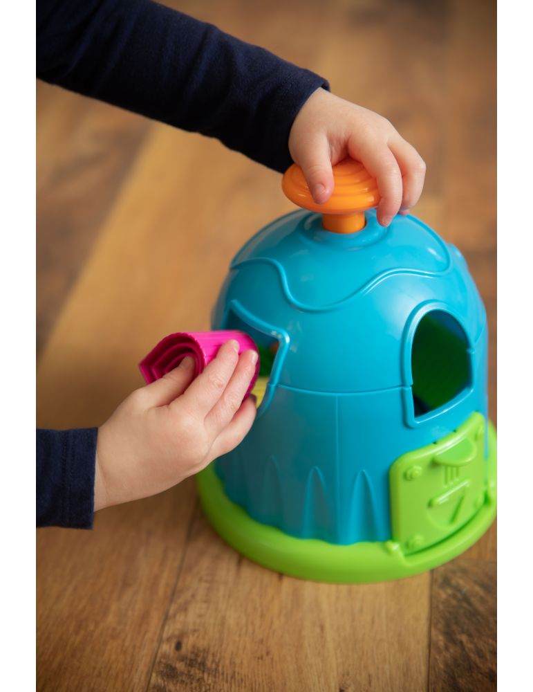 Naciśnij przycisk na szczycie sortera by poruszyć jego górną częścią i zmienić kształt otworu. Dzieci muszą eksperymentować i myśleć aby rozwiązać zagadkę i dopasować wszystkie kształty!
