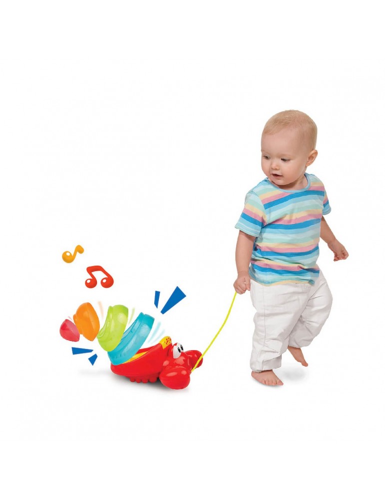 Krab Piramidka do Ciągnięcia to bardzo sprytny krab. Podczas spaceru porusza szczypcami i niespodziewanie zrzuca z siebie kolorowe muszelki zachęcając dziecko do zabawy. Piramidka z muszelek jest podświetlana zmieniającymi się światełkami LED. Muszle na grzbiecie kraba można także zablokować. Gra wesołe melodie i wydaje śmieszne dźwięki.