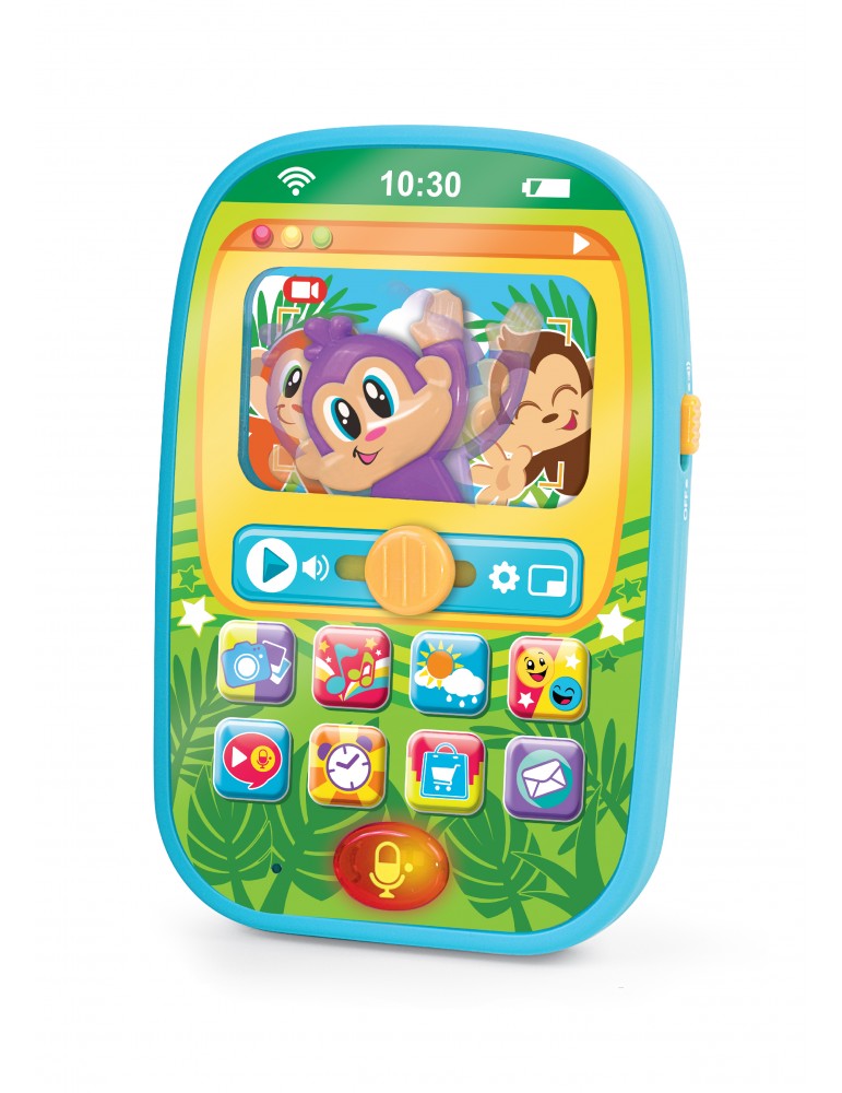 Rozpocznij swoją przygodę z telefonem od rymującego smartfonika, w którym zabawna małpka pochowała mnóstwo tematycznych rymowanek i realistycznych odgłosów. Zabawka posiada również funkcję nagrywania i odtwarzania głosu, z możliwością jego modyfikacji. Praktyczny wyłącznik dźwięku, umieszczony z boku smartfonu, pozwala na wyłączenie go po zakończonej zabawie.