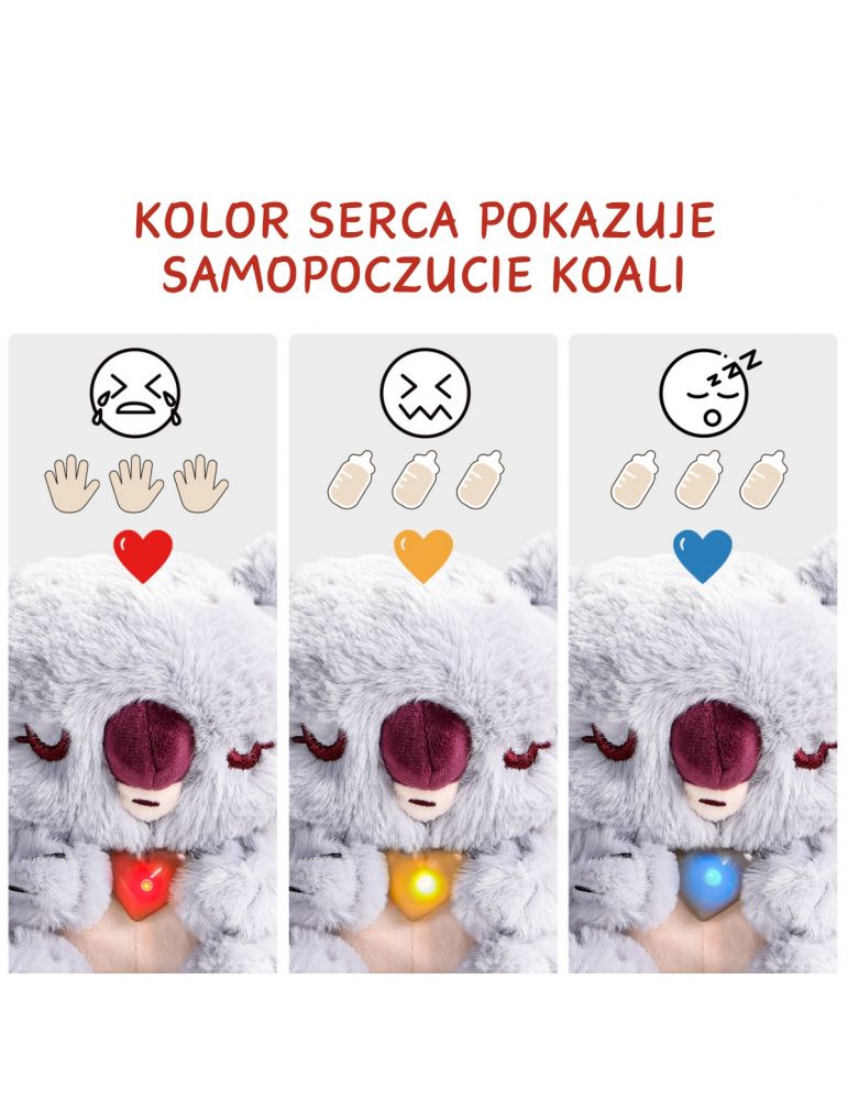 Poznaj Baby Koalę – Twojego interaktywnego przyjaciela, który pomoże Ci odkrywać, jak troszczyć się o innych! Ta zabawka uczy dzieci odpowiedzialności i empatii, reagując na Twoje działania. Baby Koala ma serce, które zmienia kolory, aby pokazać, jak się czuje – to świetna okazja, by nauczyć się reagować na potrzeby innych.
