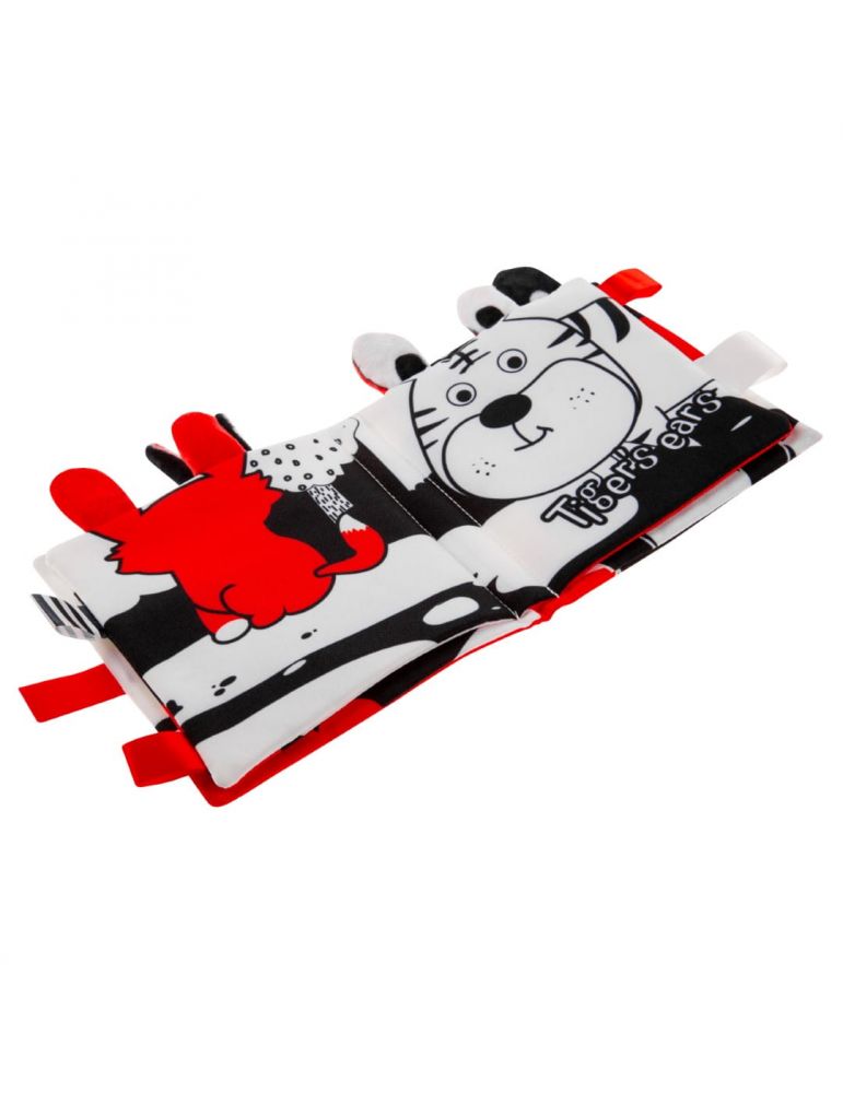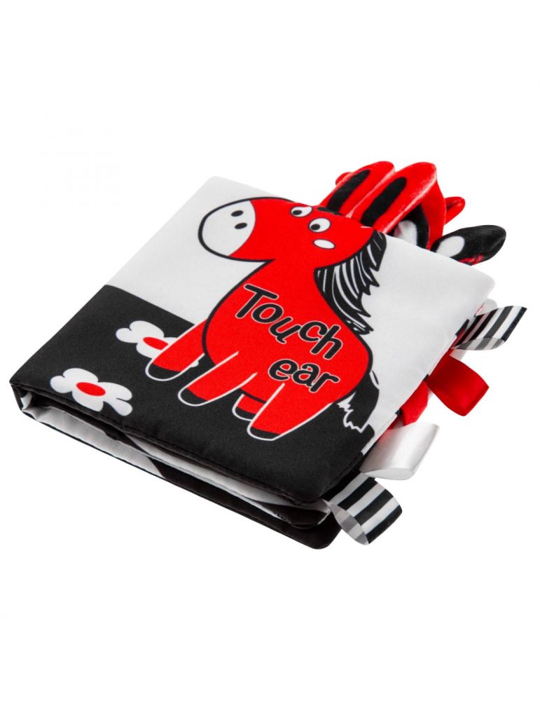 Książeczka jest wykonana z miękkiego, przyjemnego w dotyku materiału, w kontrastowych kolorach, szeleszcząca i grzechocąca.