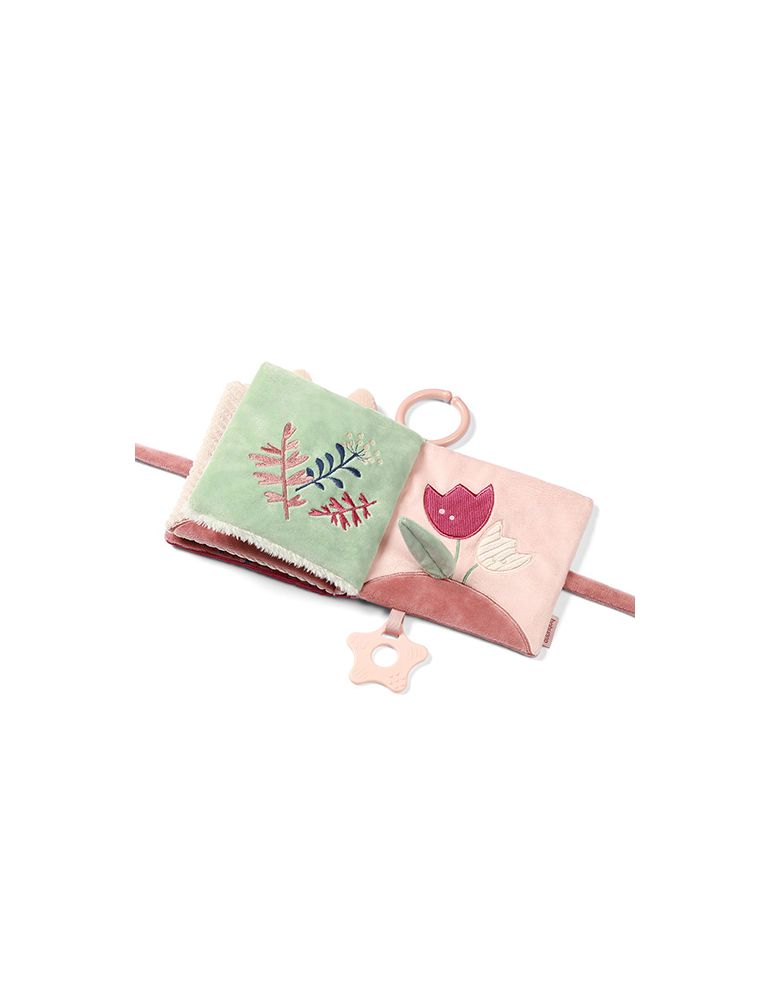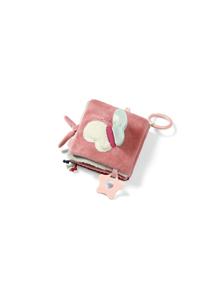 Ciekawe faktury, różne kolory i kształty rozbudzają wyobraźnię. Materiałowa książeczka dla dzieci posiada uchwyt- zawiesisz ją na łóżeczku, wózku lub foteliku.